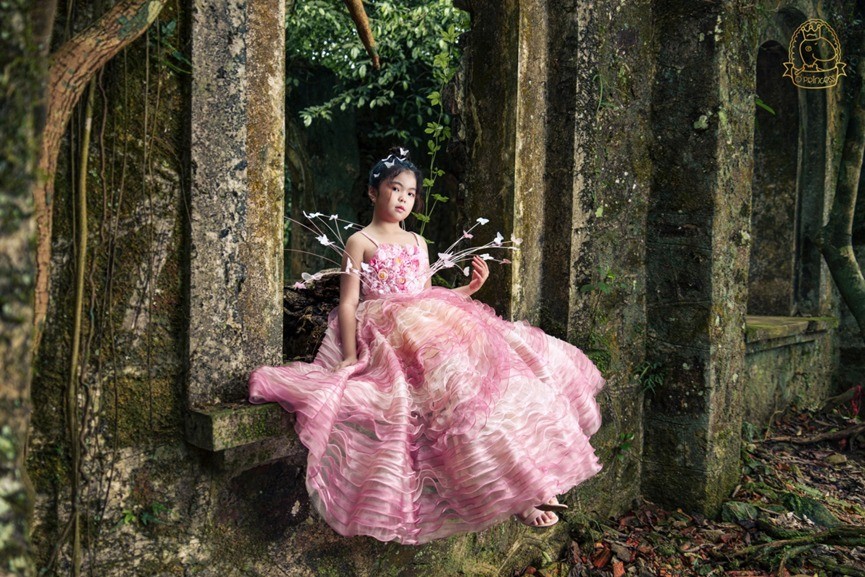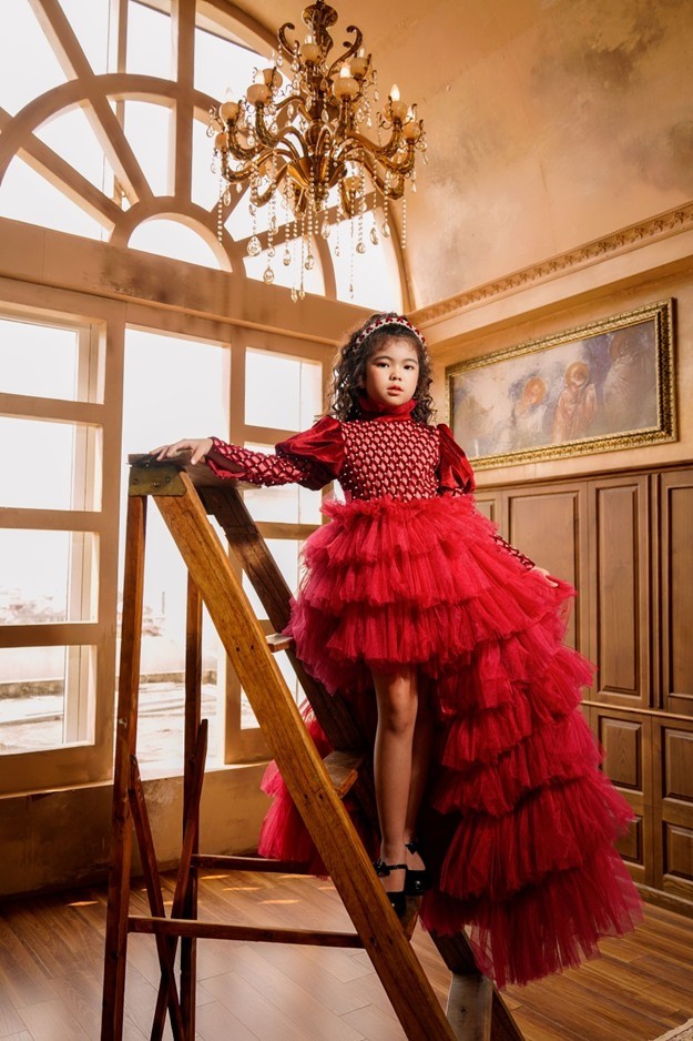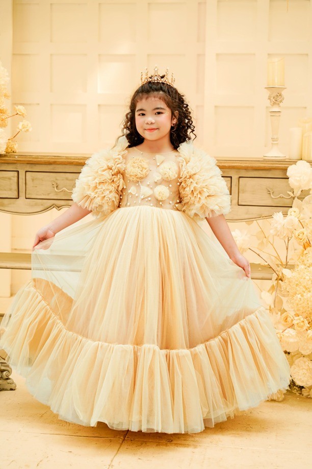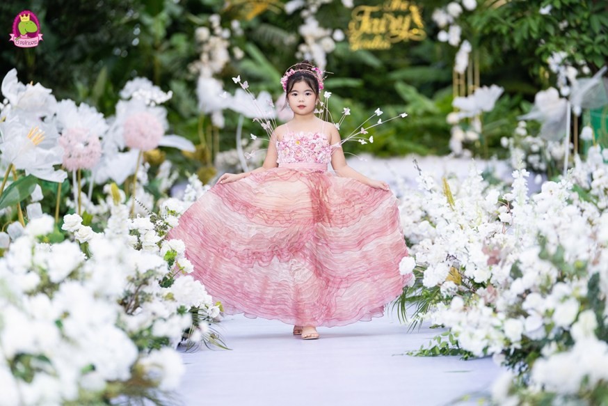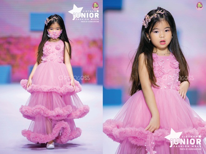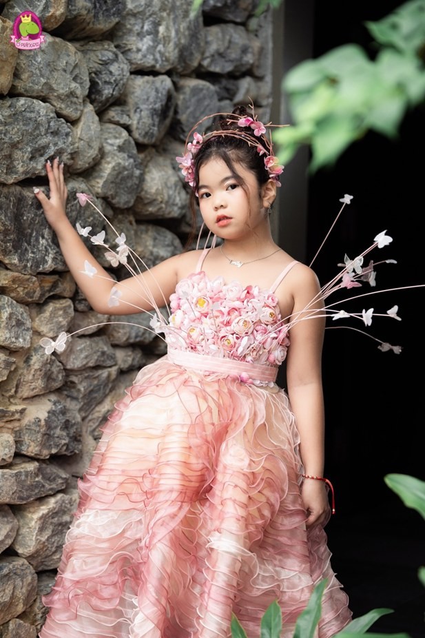 Theo đó, mẫu nhí Thanh Như xuất hiện trong một thiết kế vô cùng cuốn hút, với gam màu chủ đạo là hồng, được thiết kế vô cùng cầu kỳ và tỉ mỉ với hàng trăm bông hoa lụa được đính kết thủ công lên thân váy, cùng phần chân váy cũng được thiết kế vô cùng “độc lạ” với những hàng ruy băng voan phối may điệu nghệ để tạo nên một chiếc tùng váy bồng xòe tinh tế. Và điểm nhấn đặc biệt nhất của bộ trang phục chính là chi tiết những chú bướm được sắp đặt tài tình tạo lên hiệu ứng như một đàn bướm đang bay xung quanh mẫu nhí Thanh Như vậy.