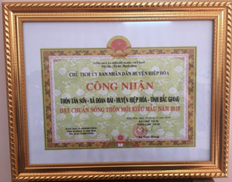 Thôn Tân Sơn, xã Đoan Bái, huyện Hiệp Hoà tỉnh Bắc Giang được Chủ tịch UBND huyện Hiệp Hòa tặng bằng công nhận đạt chuẩn NTM kiểu mẫu năm 2019