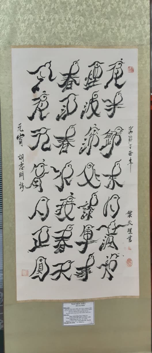 Với lối viết “Vật điểu thư”, mỗi nét chữ lại mang dáng dấp của một con chim hoặc một bông hoa. Nét mềm mại, uyển chuyển của nghệ thuật thư pháp được cụ thổi vào những con chim, bông hoa sống động và bay bổng như thật.