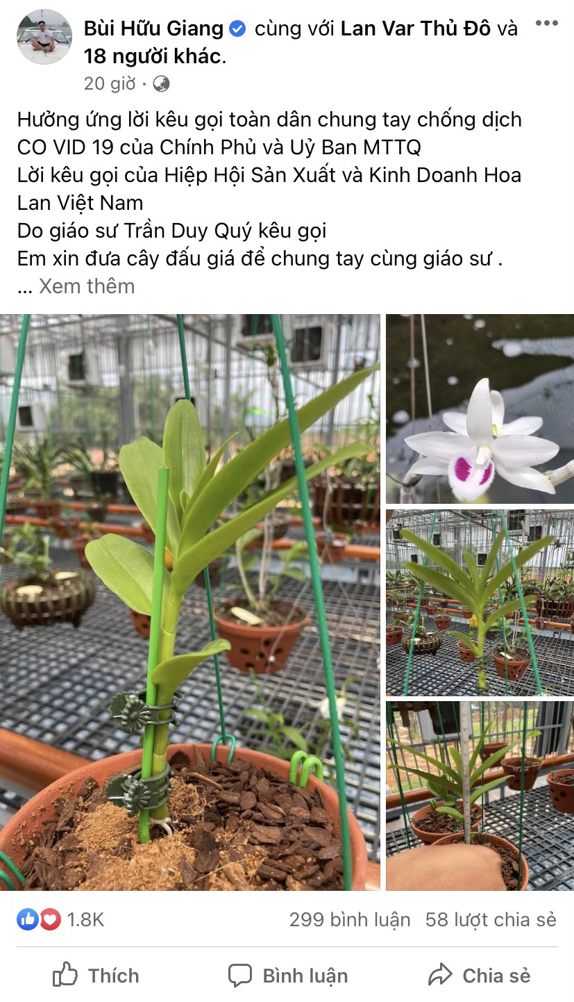 Ngoài ra anh Bùi Hữu Giang, Vườn lan Đất Mỏ cũng đã đấu giá 1 kie Bạch Tuyết trên trang cá nhân của mình, hưởng ứng đồng hành cùng với GS.
