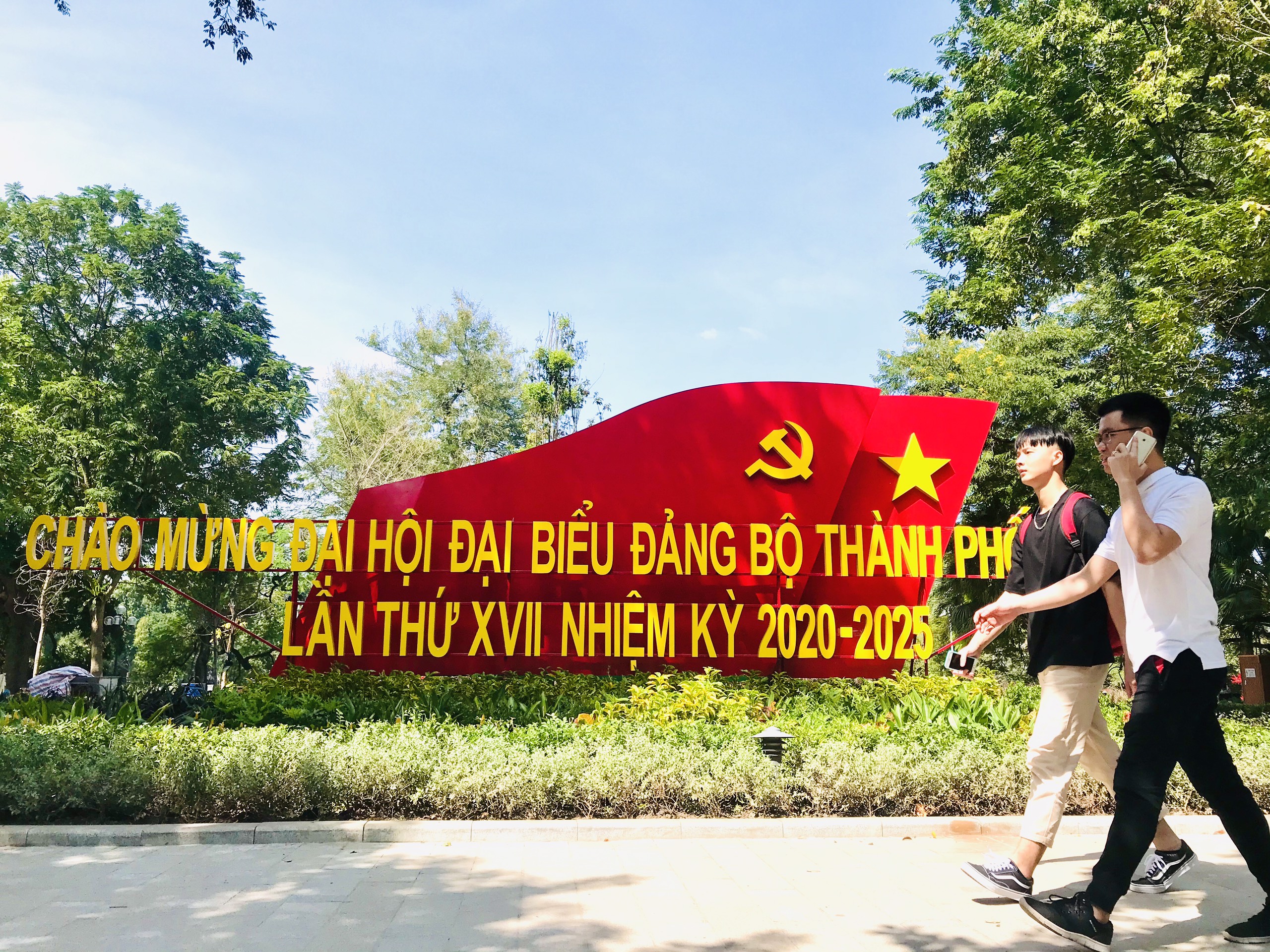 Băng rôn chào mừng đại hội Đại biểu lần thứ XVII Đảng bộ thành phố Hà Nội (nhiệm kỳ 2020-2025) trên đường Hoàng Diệu (quận Ba Đình).