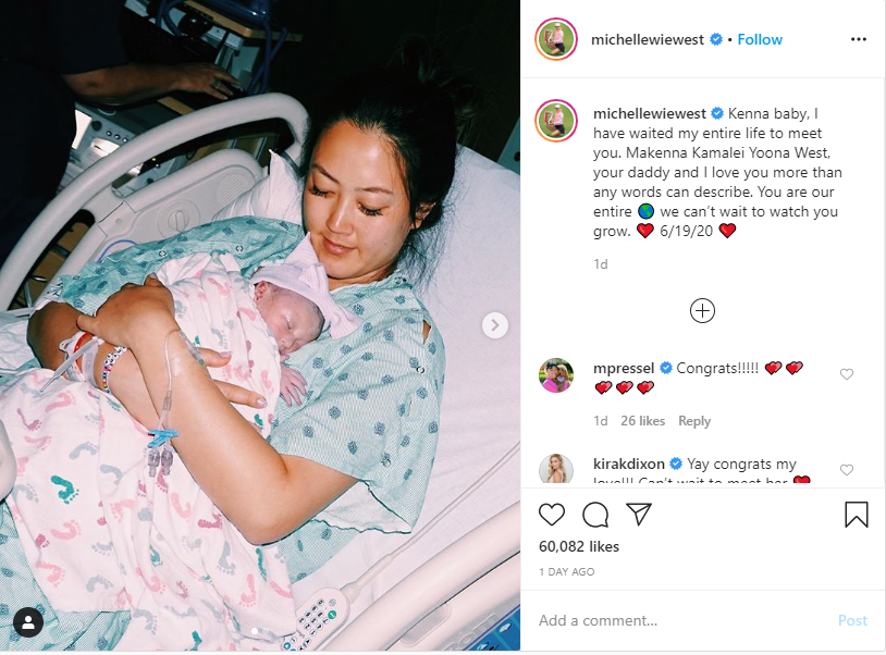 Michelle Wie và Jerry West kết hôn vào tháng 8 năm ngoái. 5 tháng sau, nữ golfer thông báo đang mang thang con đầu lòng. Ngay trước thềm Ngày của Cha (Father's Day), cô chia sẻ dòng trạng thái hạnh phúc trên Instagram: “Kenna baby, mẹ đã chờ đợi cả cuộc đời để gặp con. Cha và mẹ yêu con hơn bất kỳ từ ngữ nào có thể mô tả được. Con là cả thế giới của chúng ta!”. Bé gái của cặp đôi được đặt tên là Makennan Kamalei Yoona West.
