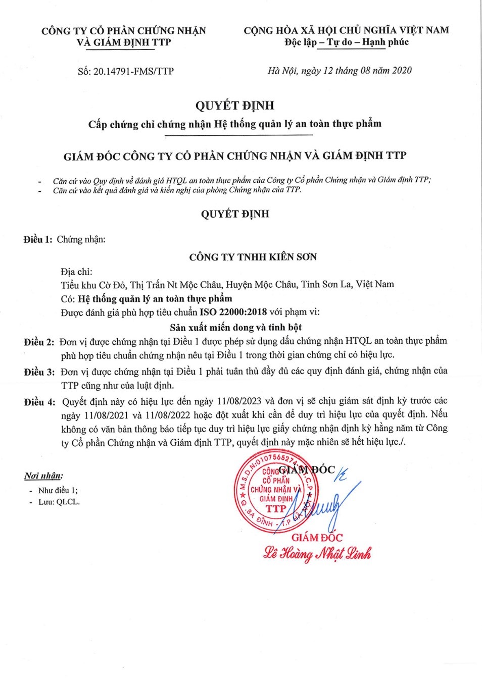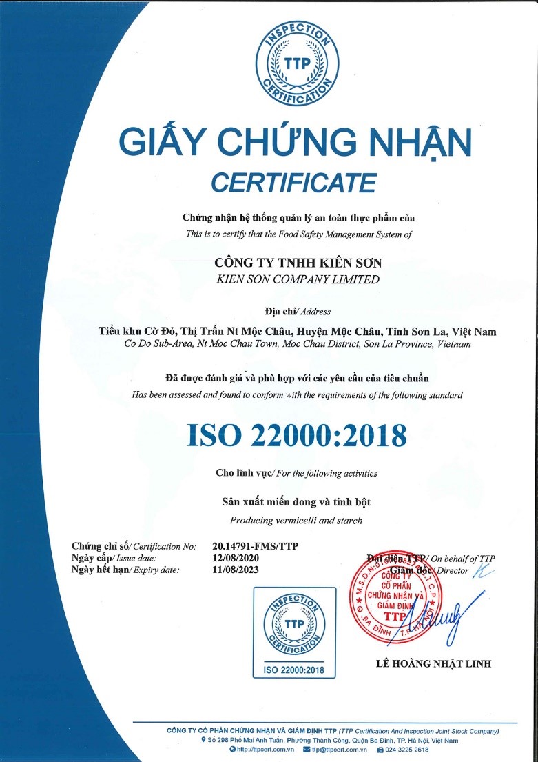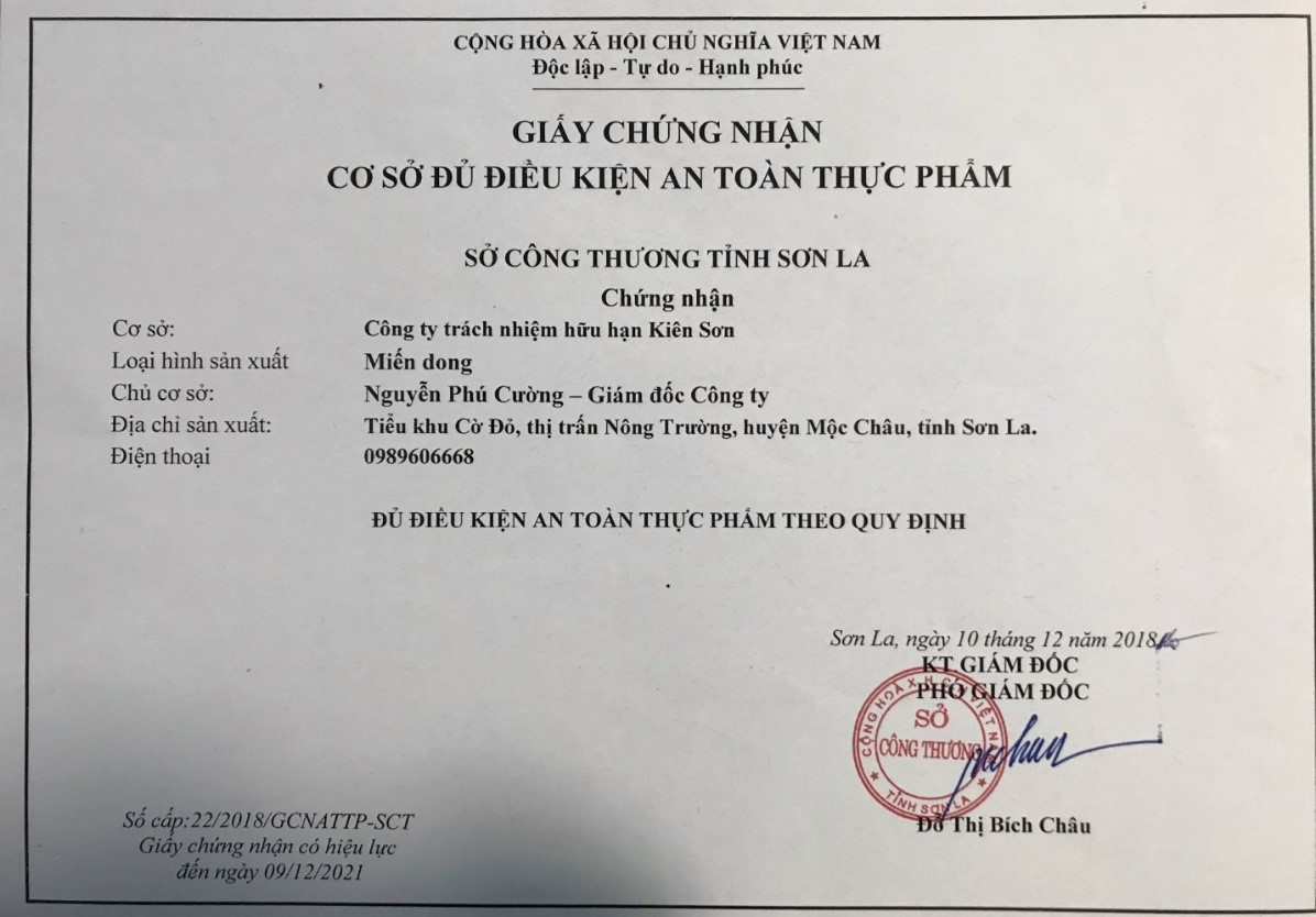 Sản phẩm miến dong Mộc Châu đã được kiểm định, đánh giá chất lượng và được Cục Sở hữu trí tuệ chứng nhận thương hiệu, được UBND công nhận là sản phẩm công nghiệp nông thôn tiêu biểu. Sản phẩm được bán nhiều nơi trong và ngoài tỉnh. Đặc biệt, được Trung tâm Khuyến công tỉnh tiếp tục hỗ trợ quảng bá thương hiệu sản phẩm, đưa miến dong Kiên Sơn trưng bày giới thiệu tại các hội chợ và chương trình xúc tiến thương mại của tỉnh, giúp kết nối và đưa hình ảnh Công ty đến gần hơn với khách hàng. Với những nổ lực đáng ghi nhận đó, sản phẩm miến dong Mộc Châu đã mang lại sự hài lòng, tin cậy ở từng khách hàng. Miến dong Mộc Châu của cơ sở Kiêm Sơn hân hạnh đem đến cho quý khách sản phẩm an toàn và chất lượng nhất!